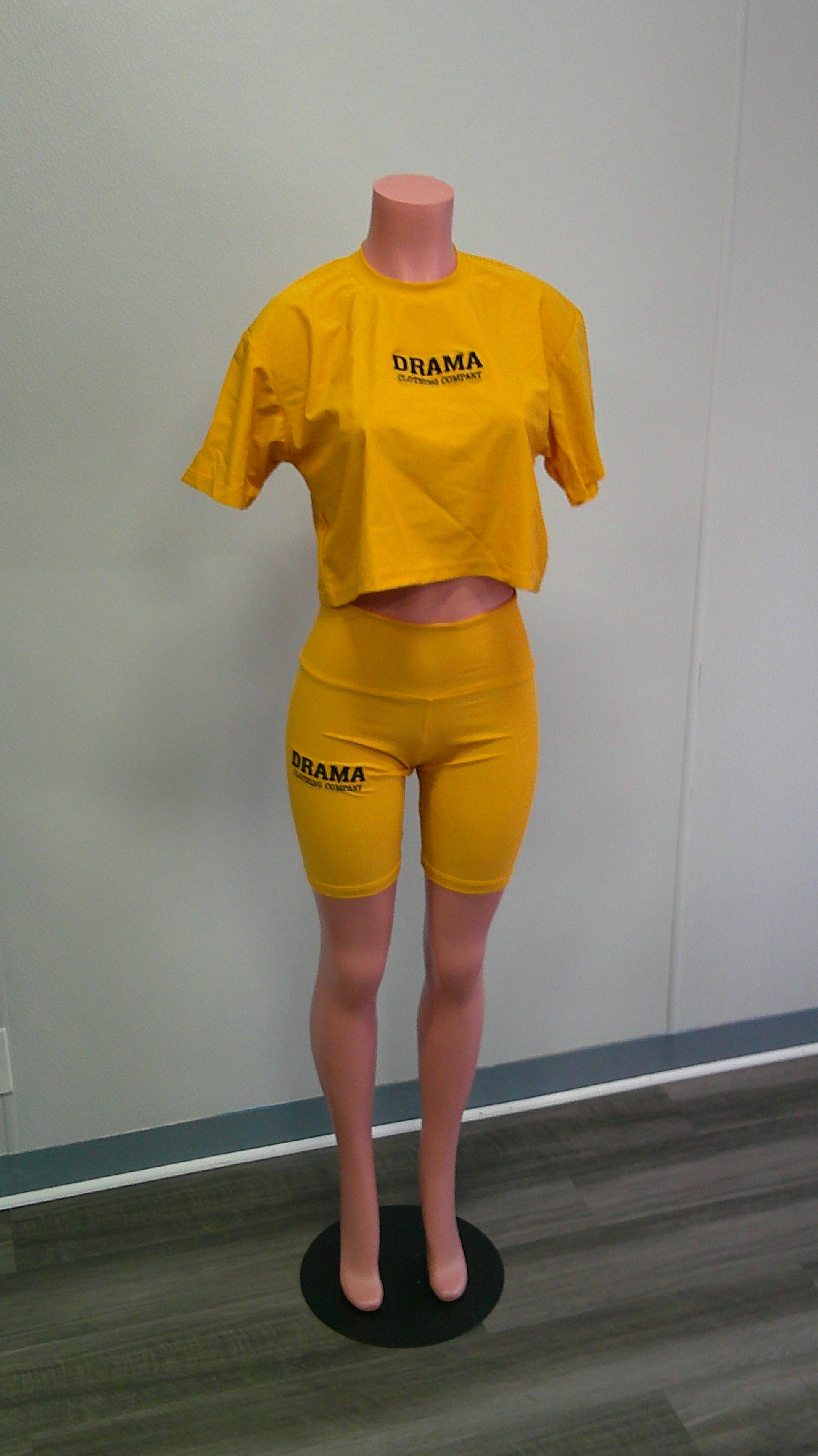 Matching 2-pieced Drama short sleeved crop top set with matching knee cut shorts
